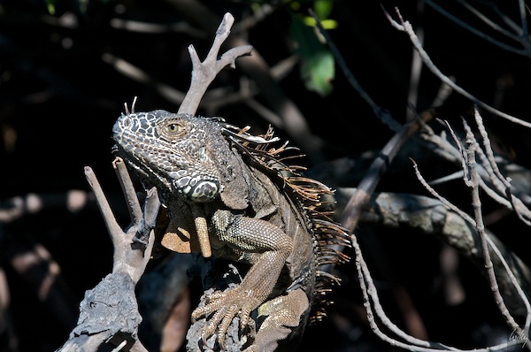 Viele Bewohner dieser Flusslandschaft verfügen über Flügel und können sich damit recht einfach fortbewegen. Als vierbeiniges Tier ist das schon viel schwieriger, auch wenn man über so eindrückliche Krallen wie dieser Leguan verfügt. Offensichtlich haben ihm aber diese Krallen und sein furchterregendes Aussehen geholfen, während vieler Jahrtausende als Art auch in diesem Dickicht zu überleben.