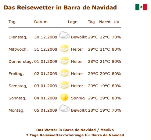 Heute habe ich von Schweizer Freunden per Mail ein absolutes Verbot erhalten, weiter über das schöne und sonnige, warme und sehr angenehme Klima hier zu schreiben. Als folgsamer Geselle halte ich mich natürlich an dieses Verbot und lasse deshalb für einmal den offiziellen Wetterbericht sprechen. Er lügt nicht.