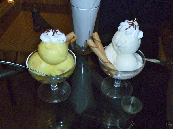 Zwei Glaces, die unterschiedlicher nicht sein könnten: Rechts Brigittes aus Kokosnuss, links meines aus Durian. Gewöhnliches gegen Exotisches in Reinkultur!