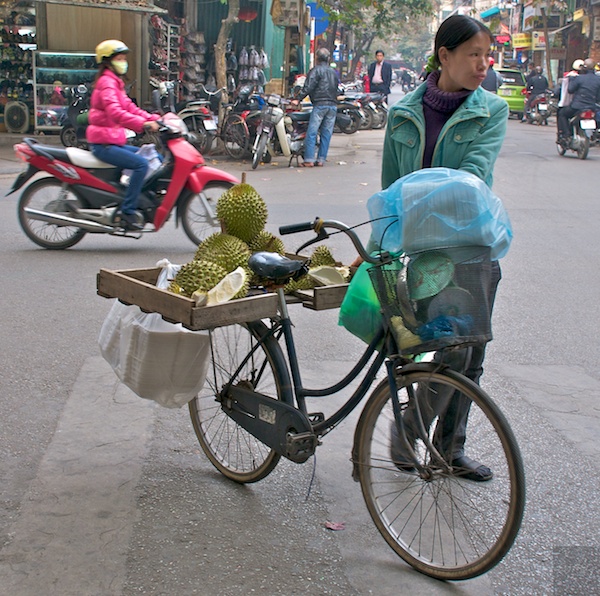 Hier frische Durians, welche in Hanoi auf den Strassen oft verkauft werden. Die Frucht sieht speziell aus, riecht und schmeckt noch viel spezieller. Sie ist auch bekannt als Stinkfrucht. Böse Zungen sagen gar sie „sieht aus wie, riecht wie und schmeckt wie Sch...“, was aber stark übertrieben ist. Mich erinnerte das Glace jedenfalls sofort an das eine Mal vor nahezu 20 Jahren, als ich in Singapur eine frische Durian ass.
