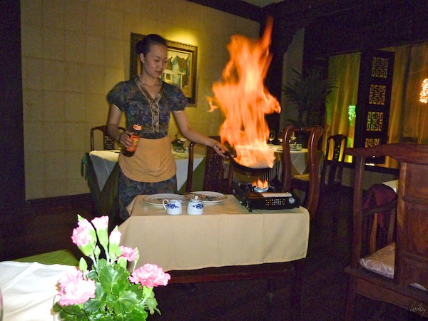 Das Desert mussten wir zuerst hart verdienen. Eine Köchin kam extra aus der Küche, um die Abfacklung persönlich zu übernehmen. Die Flamme schoss recht eindrücklich in die Höhe und der Hitzeschwall brannte mir beinahe die noch verbleibenden Haare vom Kopf. Glücklicherweise nur beinahe, ich darf also weiterhin Geld für den Coiffeur ausgeben, Juhui!