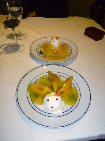 Das fertige Kunstwerk, „Fresh Mango with rhum“ schmeckte nicht nur wegen des Rums sehr gut, auch die Glacé für einmal in Form einer Maus ergänzte die ganze Chose sehr gut. Dass dieser Gang ganz Peterli-los war, störte überhaupt nicht.