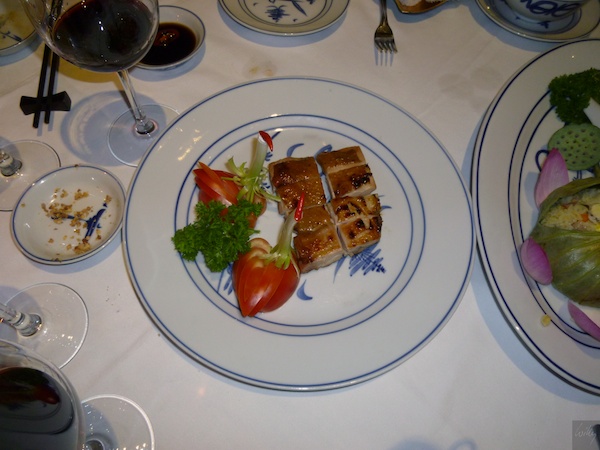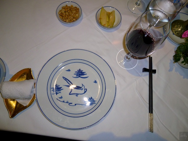 Bereits das Gedeck versprach einiges ... . Schöne Teller, exclusive Stäbchen und eine vergoldete Schale für die Serviete. Wir entschieden uns für ein Menu, welches ab zwei Personen serviert wird. Zusätzlich natürlich eine Flasche guten Rotweins, diesmal schon als Vorfreude auf Kommendes einen Australier. Die Erfahrung mit einem vietnamesischen Wein rief nicht nach einer Wiederholung.