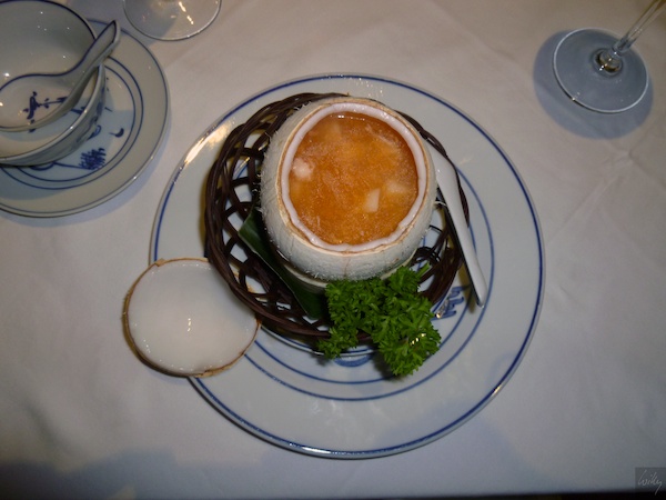 Eine „Spicy & sour Seafood soup in coconut“ mundete sehr gut. Die Kombination der Kokosnuss harmonierte ausgezeichnet mit der würzigen Suppe. Und was liegt ganz verschämt neben der von der äussersten Hülle befreiten Kokosnuss, richtig: Der nicht nur in der vietnamesischen Küche weit verbreitete Peterli durfte natürlich auch hier nicht fehlen.