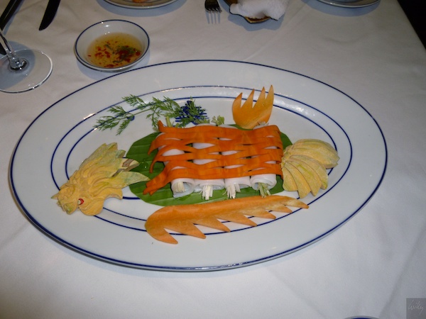 Die „Mandarin Style Spring Rolls“ als nächster Gang waren nicht wie sonst in Asien üblich fritiert, sondern roh. Das Reispapier wurde kurz in Wasser eingelegt und dann mit Crevetten und Gemüse gefüllt. Die ungekochten Rolls schmecken ganz ungewohnt, zumal immer auch etwas frische Minze als Gewürz dabei ist. Die Gemüse sind nicht einfach achtlos auf den Teller geknallt, sondern zu wahren Kunstwerken geschnitzt. Zu schade, dass sie dann wegen Überangebot meinst im Abfall landen. Kein Peterli, sondern etwas Dill zur Dekoration!