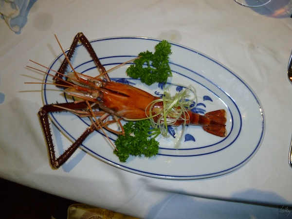 Der „Steamed King Prawn with garlic“ entpuppte sich als veritable Crustacea. Lange Gliedmassen und ebensolche Fühler. Auch hier ist leider mehr als die Hälfte Abfall, da nicht geniessbar. Der geniessbare Teil des Schwanzes ist hingegen wirklich sehr, sehr schmackhaft. Natürlich auch hier wieder eine Peterli-Orgie.