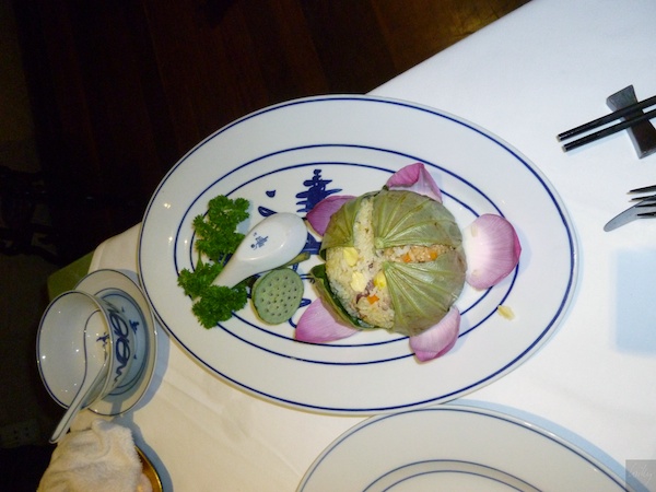 Zur gegrillten Hühnerbrust wurde „Steamed Rice in Lotus Leaves“ serviert. Die Lotus-Blütenblätter hätten uns als Dekoration mehr als ausgereicht. Die noch grüne Samenkapsel des Lotus machte sich ebenfalls sehr gut. Nicht zum Verzehr gedacht, sondern lediglich schmucke Dekoration. Der Peterli wurde nicht mal durch den Schöpflöffel verdeckt. Dann wäre aber sogar dem Koch aufgefallen, dass er eigentlich völlig überflüssig ist.