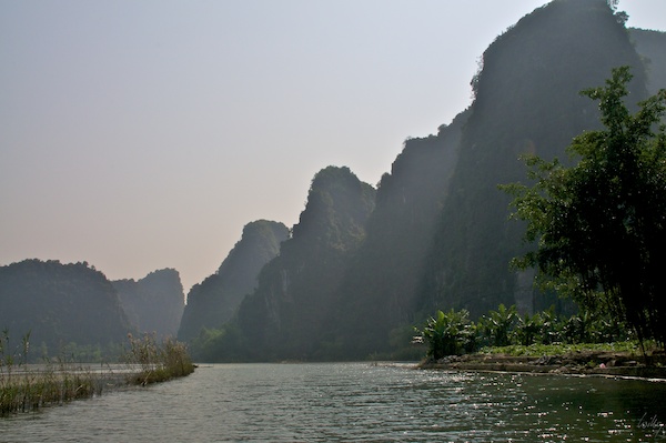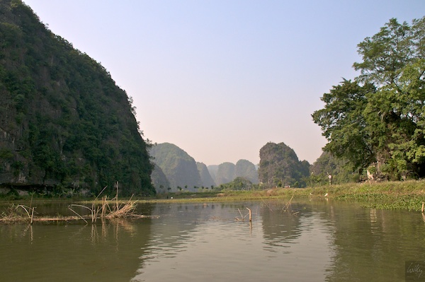 Was wie ein Widerspruch tönt, ist auch einer. Die sogenannt trockene Halong-Bay liegt etwa 100 km süd-östlich von Hanoi im Landesinnern. Weder ist diese Gebiet eine Bucht, noch ist sie trocken, ganz im Gegenteil. Die Karstlandschaft wird mit kleinen Booten befahren, das Wasser des Flusses ist aber nicht mal einen Meter tief.