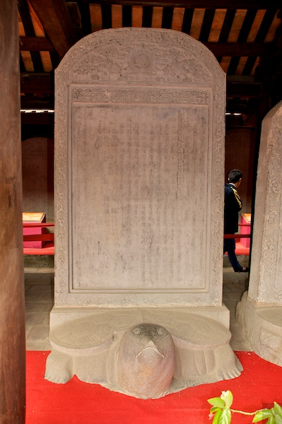 Diese Stelen auf dem Rücken von Schildkröten verewigen die Namen der besten Schüler eines Jahrganges. Diese Tradition wurde zu Beginn des letzten Jahrhunderts eingestellt, so dass die jüngsten Stelen gute hundert Jahre alt sind. Schildkröten gelten in der hiesigen Kultur als weise Tiere, deshalb tragen gerade sie diese Stelen. Auf der rechten Seite der abgebildeten Stele ist sichtbar, dass ein Name ausradiert wurde. Der entsprechende Schüler hat vermutlich seine Arbeit abgeschrieben, wie ein gewisser Herr von und zu in Deutschland. Die Ausradierung auf der Stele ist aber definitiv, sein Name ist aus dem kollektiven Gedächtnis gelöscht.