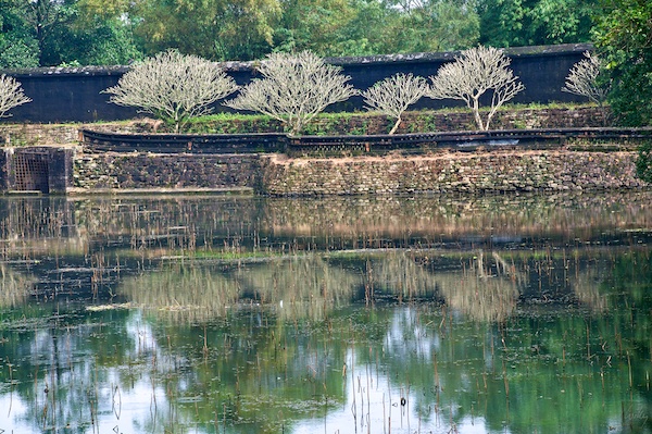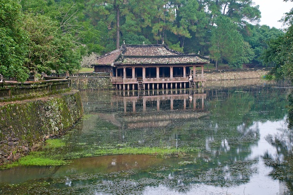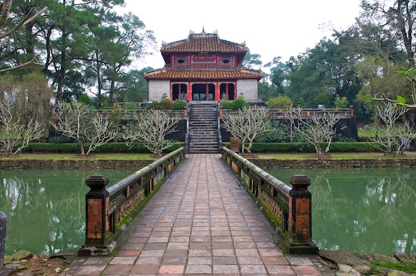 Das hinterste Gebäude des Minh Mang Tomb ist inklusive des Zugangsweges über den Teich in perfekter Symmetrie. Auch hier ist es einmal mehr die Natur, welche sich nicht ganz an die Spielregeln hält.