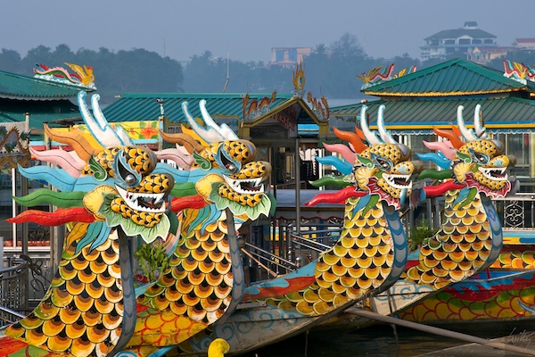 Der Parfümfluss fliesst durch Hue und auf ihm sind sogenannte Drachenboote eine grosse Attraktion. Viele Touristen benützen diese, um die Kaisergräber zu besuchen. Wir zogen den Privatchauffeur vor, da wir so unmittelbar zu den Gräbern fahren konnten und nicht noch zuerst längeren Fusswege zurücklegen mussten. Die Boote gaben für uns immerhin ein exotisches Foto-Motiv ab.