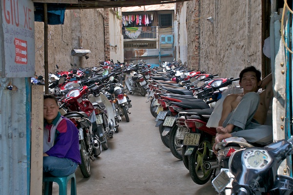 Eine Lücke zwischen zwei Häusern wird flugs zur Töff-Garage umfunktioniert und bietet so zwei Menschen eine Arbeitsstelle und ein Einkommen. In Rieh und Glied aufgereiht warten die Gefährte hier auf ihre Besitzer. Saigon verfügt über viel mehr Motorrad Garagen als solche für Autos. Wir sahen auch öfter Motorrad-Tiefgaragen.