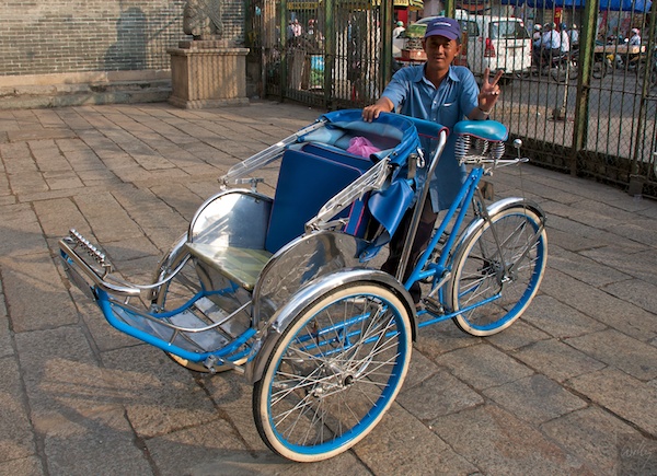 Am Nachmittag machten wir eine geführte Stadtführung mit, deren einer Teil eine Tricyclo-Tour umfasste. Durch China-Town mit seinen 500‘000 Chinesen liessen wir uns pedalen. Als Abschluss besuchten wir einen berühmten Tempel und davor verabschiedeten sich die Fahrer von uns. Auf dieses schöne Gefährt ist der Besitzer zu Recht stolz.
