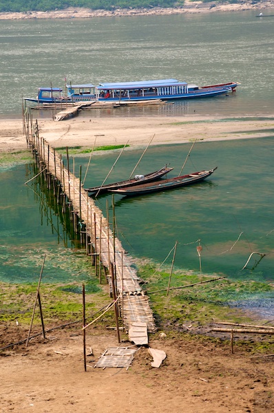 Unterwegs besuchten wir noch ein kleines Dorf, wo viele Textilien hergestellt werden. Vom oberen Rand des Ufers ergab sich dieses Bild mit unserem Boot am Ende des langen Steges aus Bambus. Der während der Trockenzeit vom fliessenden Wasser abgetrennte Tümpel ist vom Algenbewuchs tief grün und verströmt einen intensiven Geruch.