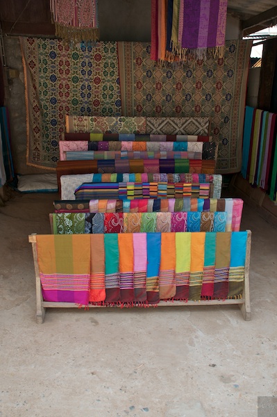 Einige der schönen Stoffe, welche im Dorf hergestellt und auch verkauft werden. Ich staune immer wieder, wie viele Läden in einem so kleinen Ort betrieben werden und wie wenig Umsatz dann pro Tag erzielt wird. Aber offensichtlich muss sich das Geschäft lohnen, sonst würden kaum so viele Leute ihr Glück damit versuchen.