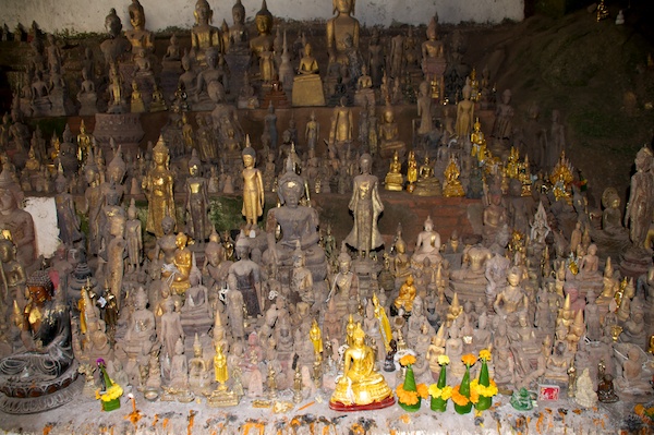 Einige der etwa 5‘000 Buddha-Figuren, welche in den Höhlen aufbewahrt wurden. Die meisten dieser Figuren wurden während des Indochina-Krieges hier vor Plünderungen in Sicherheit gebracht. Viele hundert Figuren sind heute noch hier und stellen eine der grossen Touristen Attraktionen dar, sie werden täglich von vielen hundert Besuchern angesteuert.