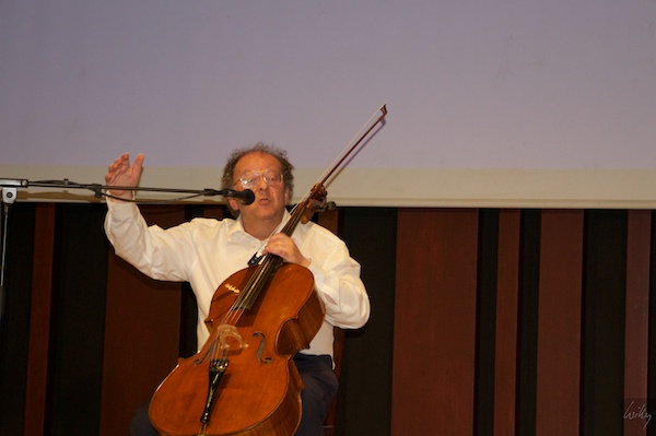Beat Richner in Aktion mit seinem liebsten Instrument, dem Cello. Zwischen den Stücken nutzt er die Aufmerksamkeit seiner Zuhörer immer wieder, um auf die Wichtigkeit von Spenden hinzuweisen.