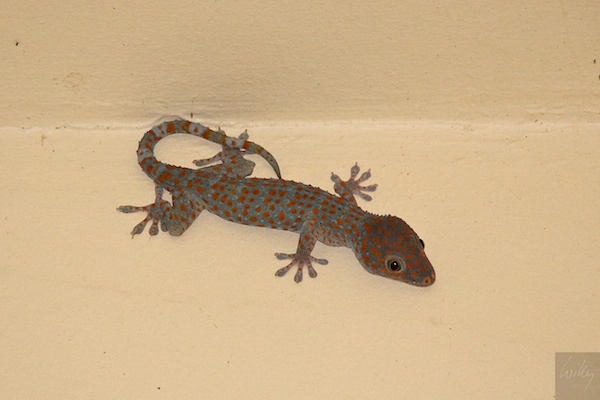 Wir geniessen heute Abend noch eine Flasche australischen Weines, den wir von unseren Bekannten Cheryl und Dave in Sydney erhielten. Wir wollen ihn nicht nach Hause mitnehmen, sondern in dieser stilvollen Umgebung würdigen. Dieser grosse Gecko von etwa 25 cm Länge schaut uns von der Decke der Terrasse her zu und frisst hoffentlich alle Mücken, damit wir nicht noch mit Dengue oder Malaria nach Hause zurückkehren müssen.