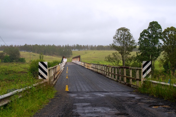 Noch in New South Wales gab es ein vermeintliches Problem, welches uns Bauchschmerzen bereitete: Der Besitzer des gestrigen Campgroundes sagte uns, dass diese Brücke täglich zwischen 11 und 13 Uhr gesperrt sei, da gerade Sanierungs-Arbeiten stattfänden. So fuhren wir rasant auf die heikle Stelle los, die nahezu zwei Stunden vom Ausgangsort entfernt lag. Als wir dann um 10:15 dort ankamen, waren die Arbeiten glücklicherweise bereits abgeschlossen und auf einer Tafel bedankten sich die Verantwortlichen für die Geduld der Autofahrer. Uff, kein Problem.