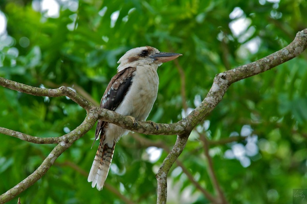 Kurz danach kam mir sogar noch ein Kookaburra vor die Linse, die lange Brennweite war auch diesmal von Nutzen. Dieser Exemplar. ein Laughing Kookaburra, kommt in ganz Ostaustralien vor, sein Bruder, der Blue Winged Kookaburra lebt nur hier und nördlich von unserer heutigen Position. Das einzige Exemplar sahen wir heute zu kurz, um ein Bild zu machen, ich hoffe, dass sich ene weitere Gelegenheit bald findet. Beide Kookaburra sind typische Vögel Australiens.