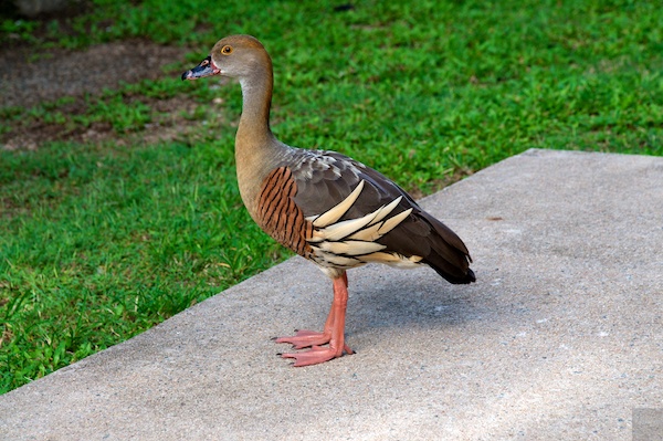 Auf dem Campground erhielten wir schliesslich noch Besuch von Whistling Ducks oder Pfeiff-Enten. Ihr schönes Gefieder passt gut zu den roten Füssen. Diese neugierigen Vögel strichen fast ohne Scheu ums Auto und suchten nach etwas Fressbarem, das ja jederzeit aus dem Camper fallen könnte ...