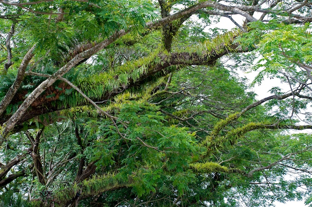 Ein Blick in den Wald zeigt verschiedene Grüntöne, einerseits von Laubbäumen, andererseits aber auch von grossen Palmen. Farne halten sich an den Stämmen einzelner Bäume. Die Lianen wären schon bereit, damit sich Tarzan an ihnen hochschwingen könnte. Wenn er denn in diesen Wäldern lebte.