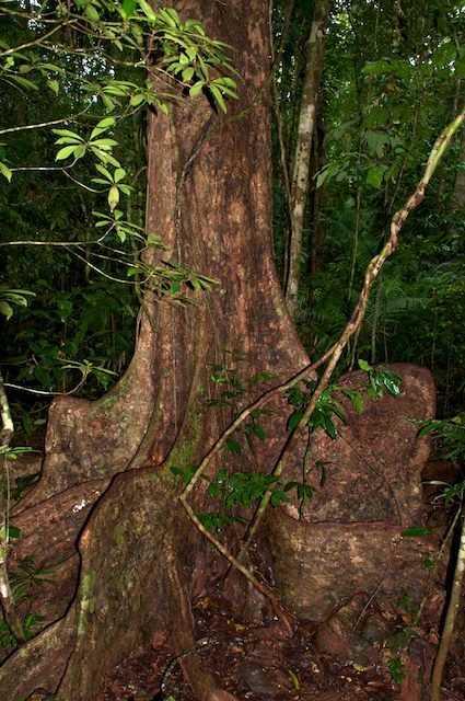 Der Daintree National Park schützt den Regenwald in diesem Teil des nördlichen Queensland. Dieser Baum ist ein gutes Beispiel für einen Urwaldriesen, der gleichzeitig auch Standort für eine Vielzahl von kleinen Pflanzen ist. Allerlei Farne, Moose, Orchideen und Bromelien bewohnen den grossen Baum.