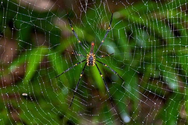 Einmal mehr eine riesige Spinne: Gute 8 cm misst sie vom einen Ende der Hinterbeine bis zum anderen Ende der Vorderbeine. Schwarze Gliedmassen mit giftig-gelben Gelenken sowie ein roter Kopf kennzeichnen dieses Tier. Ein Spinnenforscher erkennt diese Art sicher sehr schnell. Ich bin kein solcher und nur von den Farben fasziniert.