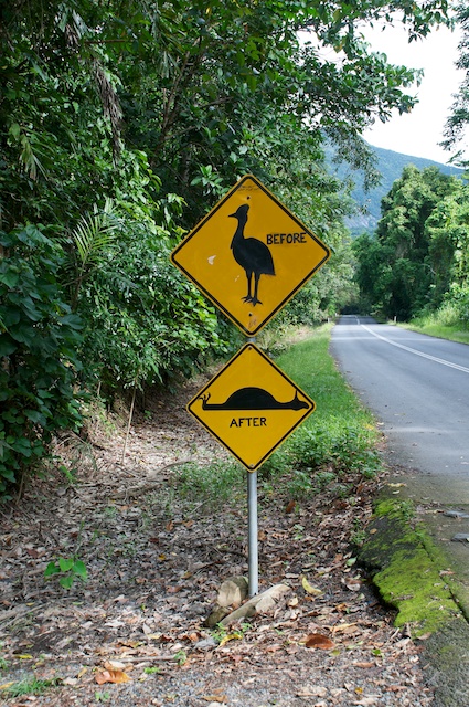 Neben dem Platypus suchen wir immer noch einige australische Einheimische, so zB. den Cassowary. Statt eines lebendigen Exemplars trafen wir auf eine lässige „Verunstaltung“ eines Verkehrschildes in einem Nationalpark. Hoffentlich entspricht die Aussage nicht der Wahrheit!