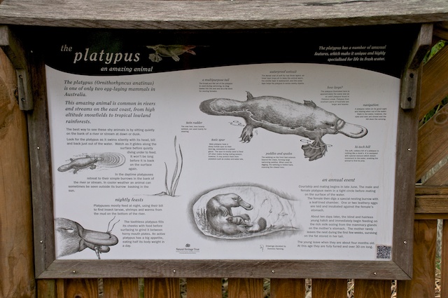 Ein Platypus sahen wir zwar nicht, aber immerhin diese Tafel, auf welcher das Tier vorgestellt wird. Mindestens einen Eindruck des Tieres gewinnt der Leser so.