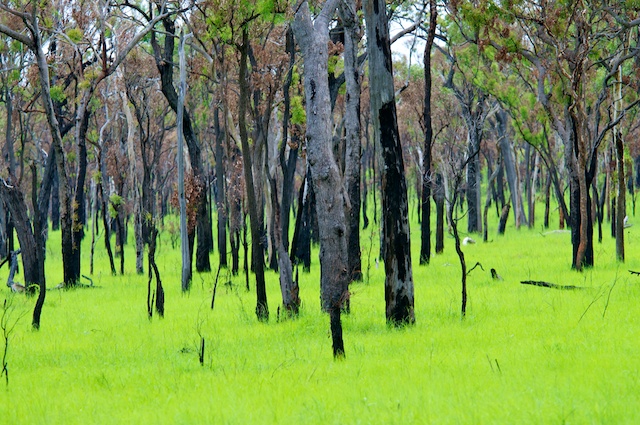 Kurz vor dem heutigen Etappenziel wütete vor wenigen Wochen ein Buschbrand und vernichtete das ganze Unterholz unter den Eukalypten. Bald schon setzten aber die Regenfälle ein und schon spriesst neues, hellgrünes Gras. Die Natur lässt sich nicht so einfach unterkriegen!