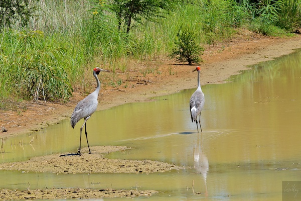 Unmittelbar neben der Strasse sah ich in einem kleinen Flusslauf zwei Brolgas, die australische Variante des Kranichs. Ein Schnellstopp und dann Wenden auf der engen Strasse machten es möglich, dass wir die Vögel noch sahen, bevor sie Reissaus nahmen. Die Tiere in dieser Gegend sind recht scheu, da kaum je Menschen zu Fuss hier unterwegs sind. Die vorbei brausenden Autos stören die Vögel überhaupt nicht, sobald aber ein Auto stehen bleibt und gar der Motor ausgeschaltet wird, fliegen sie auf und davon.