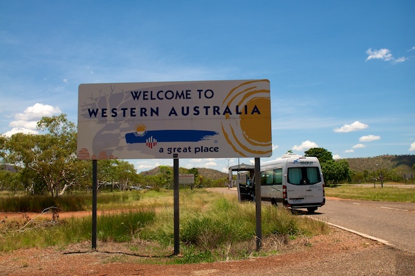 Kurz vor Kunanurra, unserem heutigen Etappenort überquerten wir die Grenze zwischen den Northern Territories und Western Australia. Letzterer Bundesstaat ist der mit Abstand grösste Australiens. 2.5 Mio. km2 Fläche oder etwa 50 mal die Schweiz! Die mit der gigantischen Bevölkerung von 2.3 Mio. Einwohnern. 1.8 Mio davon leben in und um Perth herum. Die Bevölkerungsdichte des restlichen Landes ist etwa 0.2 Einwohner pro km2!