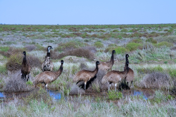 Den Schlusspunkt setzt heute diese Emu-Familie, welche das stehende Wasser im Feld offensichtlich geniesst und sich vom vorbei brausenden Verkehr nicht beeindrucken lässt.
