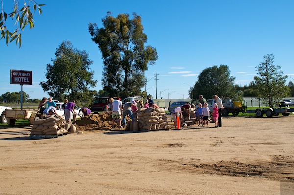 Einer der Flüsse (Murrumbidgee), welche die ganzen Probleme verursachen, läuft direkt hinter unserem heutigen Campground vorbei, noch wirkt er sehr harmlos, doch die Bewohner von Hay trauen dem Frieden offenbar nicht ganz, denn ...