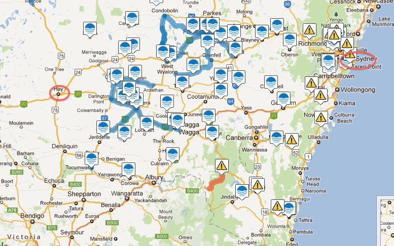 Auf diesem Bild habe ich unseren heutigen Standort Hay und unser Ziel Sydney markiert. Die blauen Markierungen sind Überflutungen der Strasse, wo kein Durchkommen ist. So wie es zur Zeit aussieht, gibt es genau einen Weg ans Ziel. Ob dies auch morgen früh noch so sein wird, wird sich zeigen. Eine gute Woche haben wir noch, um die restlichen paar hundert Kilometer zurück zu legen. Mehr als genug Zeit.