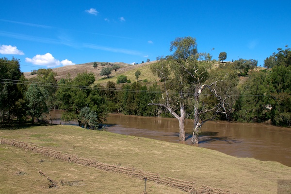 In der kleinen Ortschaft Gundagai holte uns die Flut heute doch noch ein. Von einem Aussichtspunkt im Süden des Ortes liegt der Fluss Murrumbidgee in der Ebene. Sein braunes Wasser überschwemmte hier die ganze Gegend, doch viel Wasser ist bereits abgeflossen - und verursacht nun Probleme weiter unten im Flusslauf.