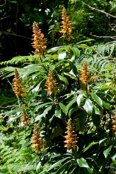 In den Wäldern dieser Gegend ist der Hahnenkamm (Isoplexis canariensis) oft anzutreffen, sein leuchtendes Orange hebt sich eindrücklich vom dunklen Hintergrund ab.