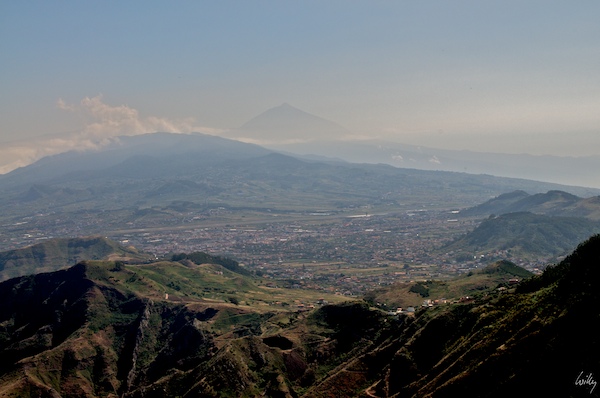 Natürlich zeigt sich der Teide auch von hier aus, von einem Aussichtspunkt mit schöner Sicht auf das Tal von La Laguna ist er in der Ferne im Dunst gut auszumachen, in dieser Aufnahme allerdings nur schwach, die Technik ist hier dem menschlichen Auge einmal mehr klar unterlegen.