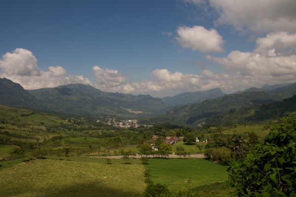 Schon bald nach Villahermosa stieg die Strasse an, damit wir die angestrebte Höhe auch erreichen konnten. Immer wieder boten sich Ausblicke auf die grüne Landschaft, die intensiv landwirtschaftlich genutzt wird: Viehzucht, Mais und auch Bananen sind typische Produkte.