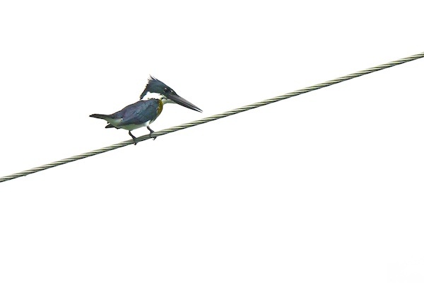Ein Eisvogel sitzt auf einer Stromleitung, glücklicherweise mussten wir nicht aussteigen, um ihn zu fotografieren. Der vorüber brausende Verkehr macht den Vögeln nichts aus, sobald jedoch ein Auto anhält und die Passagiere aussteigen, fliegen sie davon.